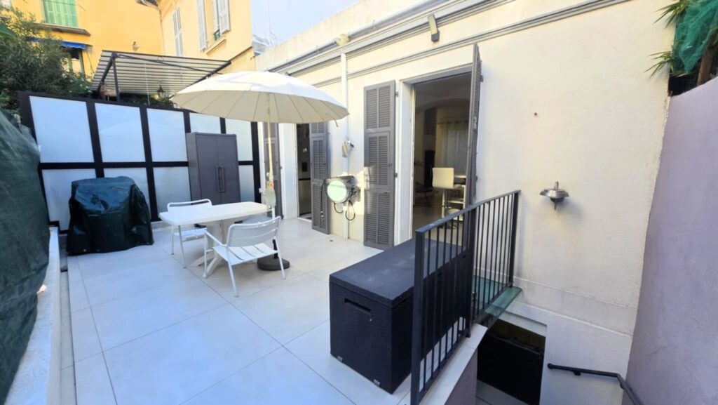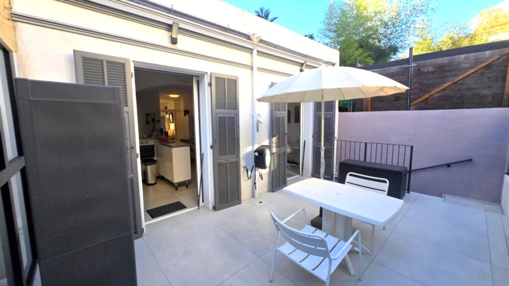 La maison offre une agréable terrasse et la possibilité de stationner un véhicule dans l’enceinte de la propriété.