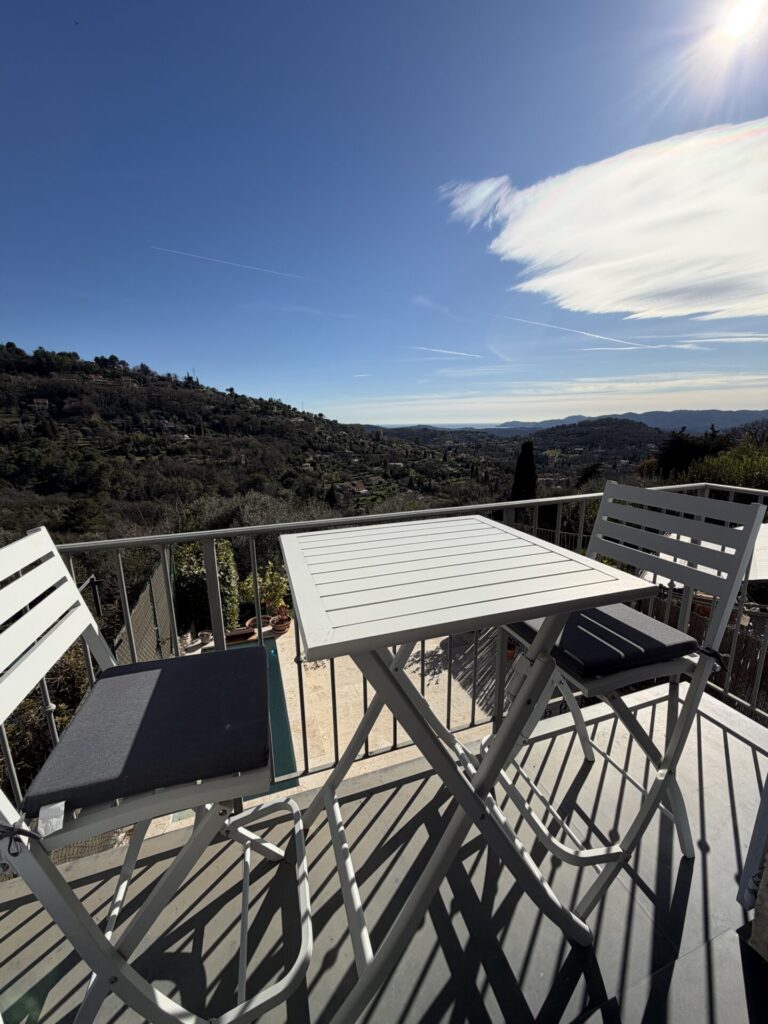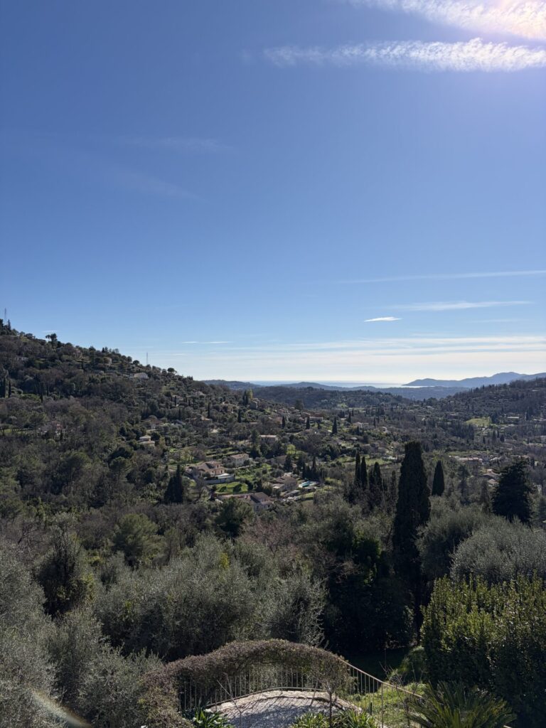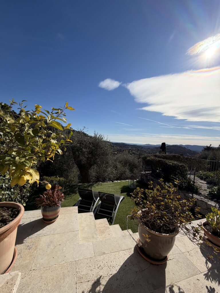 restanque avec pelouse synthétique. Vue imprenable sur la verdure environnante et la mer avec une exposition sud-est.