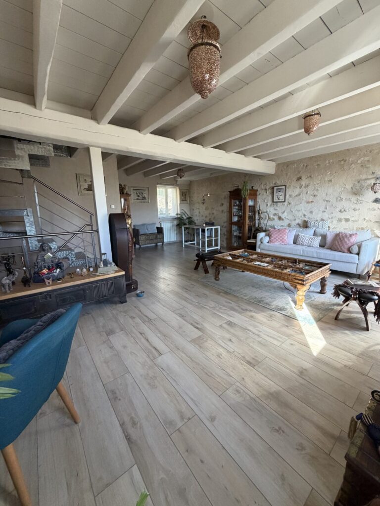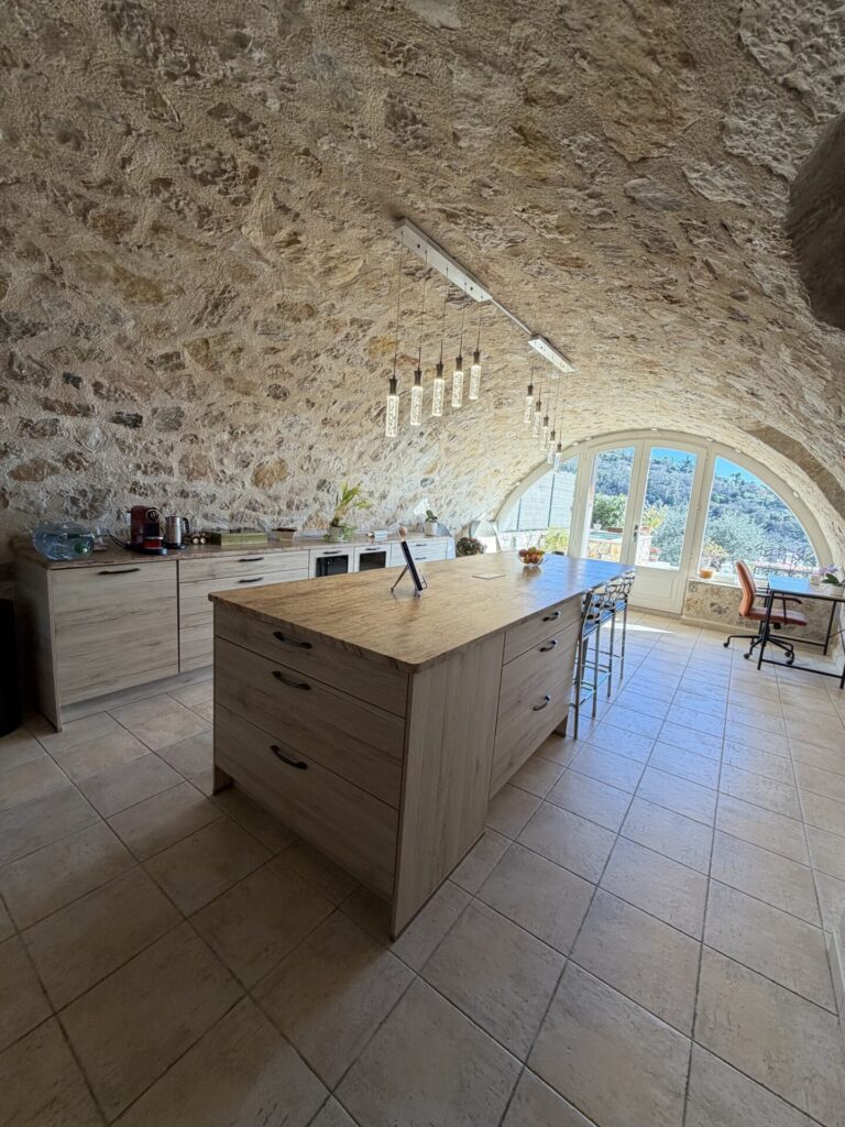 Au rez-de-jardin, vous trouverez une cuisine dinatoire sous une voûte en pierres, véritable atout de cette maison, entièrement équipée avec des matériaux de haute qualité, parfaite pour les passionnés de cuisine. De plus se trouve un espace fermé pour cave à vin et buanderie.