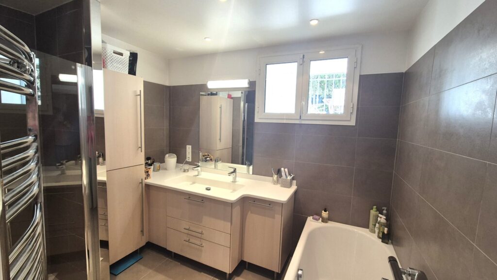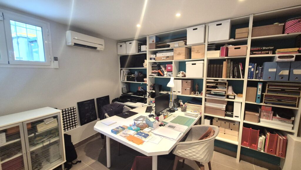 Au sous-sol, vous découvrirez une chambre, un bureau, une grande salle de bains avec baignoire, douche et WC, une buanderie et un grand dressing.